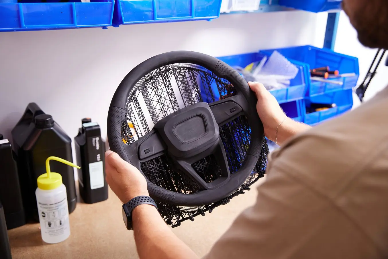 Form 4L 能夠實現的表面處理使真人大小的原型製作更加逼真——這款方向盤原型在其 3D 模型中內建了最終將用於製作最終用途的織物外殼的紋理。