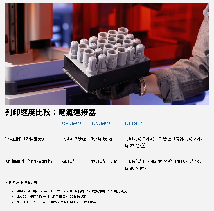 隨著越來越多的企業將3D列印技術應用於生產和快速迭代,3D列印速度在選擇技術時成為重要的考量。理想的3D列印機應該能夠快速生產高品質零件,同時又不犧牲精度、可靠性或材料性能。 FDM和SLS製程顯著提高了列印速度,而樹脂3D列印機的速度更快,使其成為目前速度最快的積層製造流程。像LFD這樣的新型列印引擎更進一步,可以在短短幾小時內完成大多數零件的列印,甚至在幾分鐘內完成小型零件的列印。