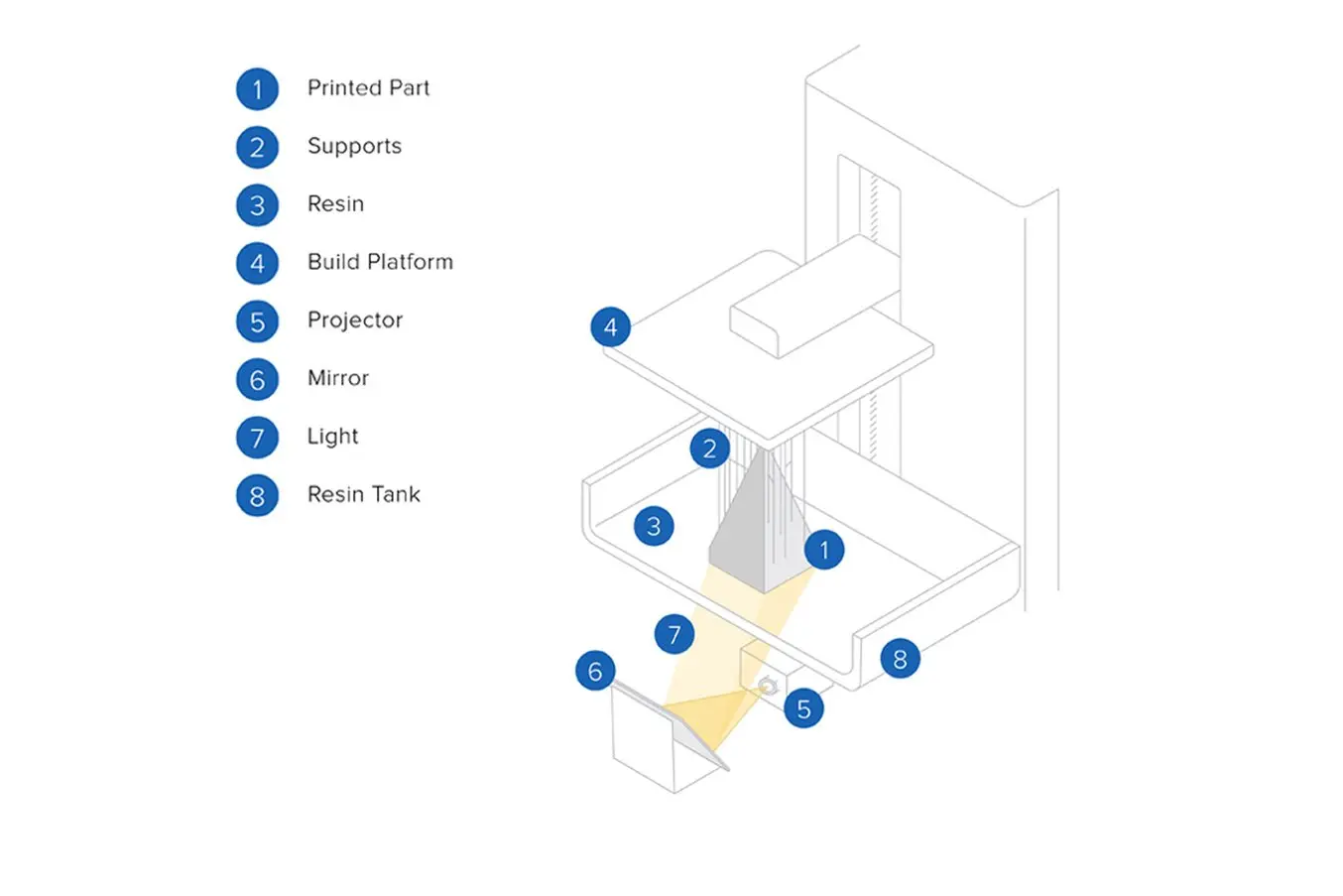 DLP列印機的光源透過排列在半導體晶片上的微鏡陣列進行投射。每個微鏡陣列代表零件的一個體素(或3D像素)。微鏡陣列的數量和列印區域的大小決定了零件的解析度。