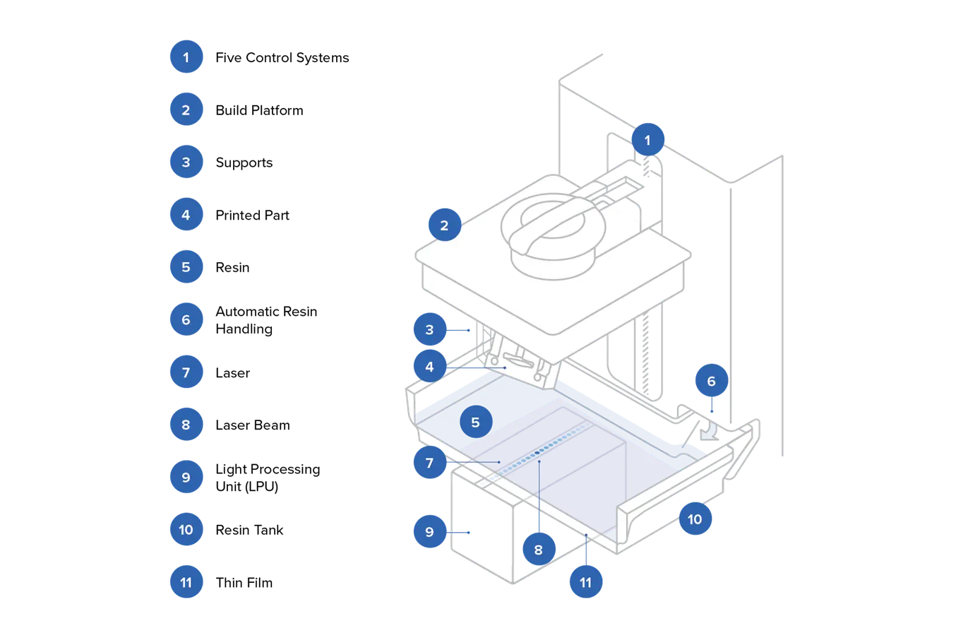 傳統的SLA列印機以裝滿液態樹脂的大型樹脂槽為核心,透過位於樹脂槽上方的雷射選擇性地固化樹脂頂層。這些系統體積龐大、價格昂貴,且需要複雜的配套設施,因此僅限於財富500強企業等少數公司使用。